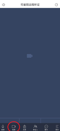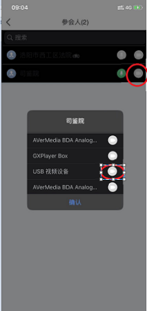 点击屏幕空白处,调出软件下方选项卡。点击“参会人”按钮可跳转到所有参会人列表。点击目标用户右侧摄像机按钮,可显示该用户所有连接的视频设备,根据需要选择显示的画面。